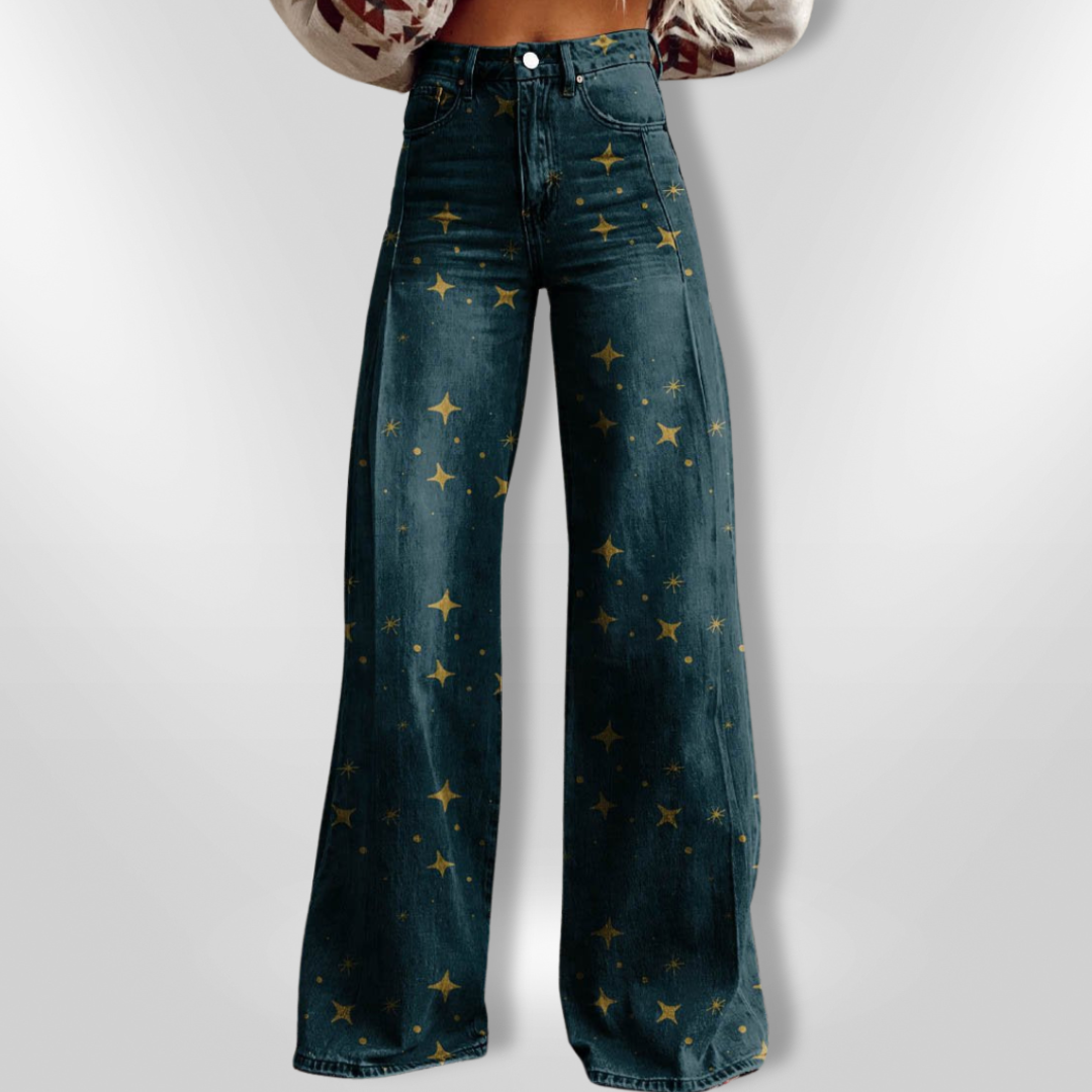 The CELESTE | Vintage Flared Pants bring a dreamy celestial charm to your wardrobe with their deep-washed denim and golden star accents. Designed for both comfort and style, these high-waisted flares offer a flattering silhouette that enhances your retro-inspired outfits. Perfect for stargazers and fashion lovers alike, these pants shine effortlessly in any setting.