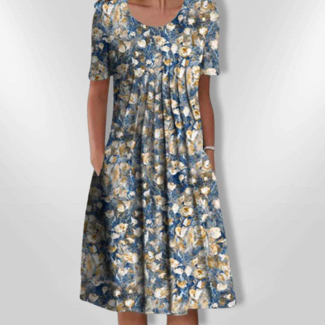 The ERIN | Elegant Dress is a timeless item that combines comfort with effortless charm. Featuring a delicate floral print on a soft, supple fabric, this dress is perfect for warm days and casual outings. With its relaxed fit and practical side pockets, it combines style and functionality for everyday elegance.