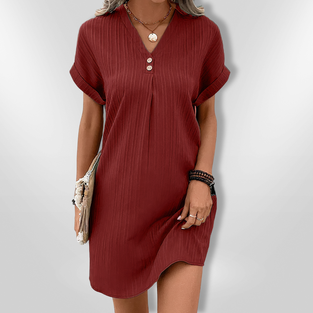 The LAURA | Elegant Dress is a versatile and effortlessly chic piece, perfect for any occasion. Featuring a relaxed fit with a flattering V-neckline and delicate button details, this dress exudes understated elegance. Its soft, ribbed fabric ensures comfort while maintaining a stylish and sophisticated look.
